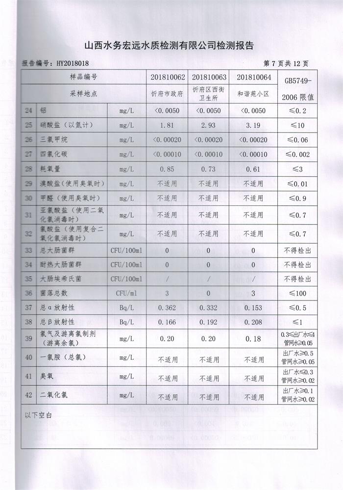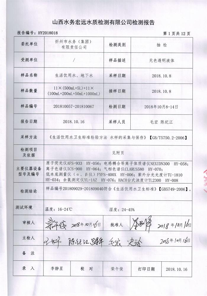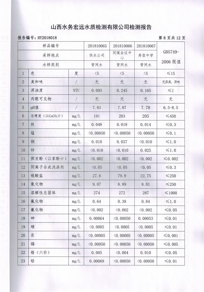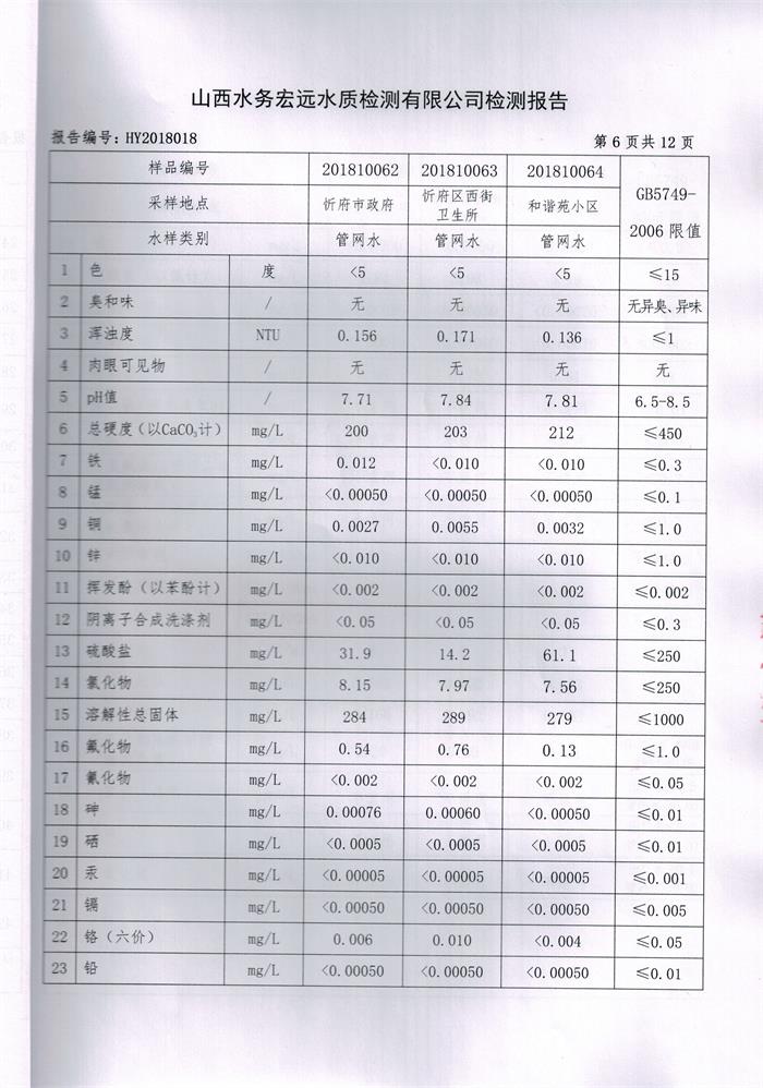 忻州城區(qū)公共供水水源水、出廠水、管網(wǎng)水、管網(wǎng)末梢水2018年10月份水質信息公示