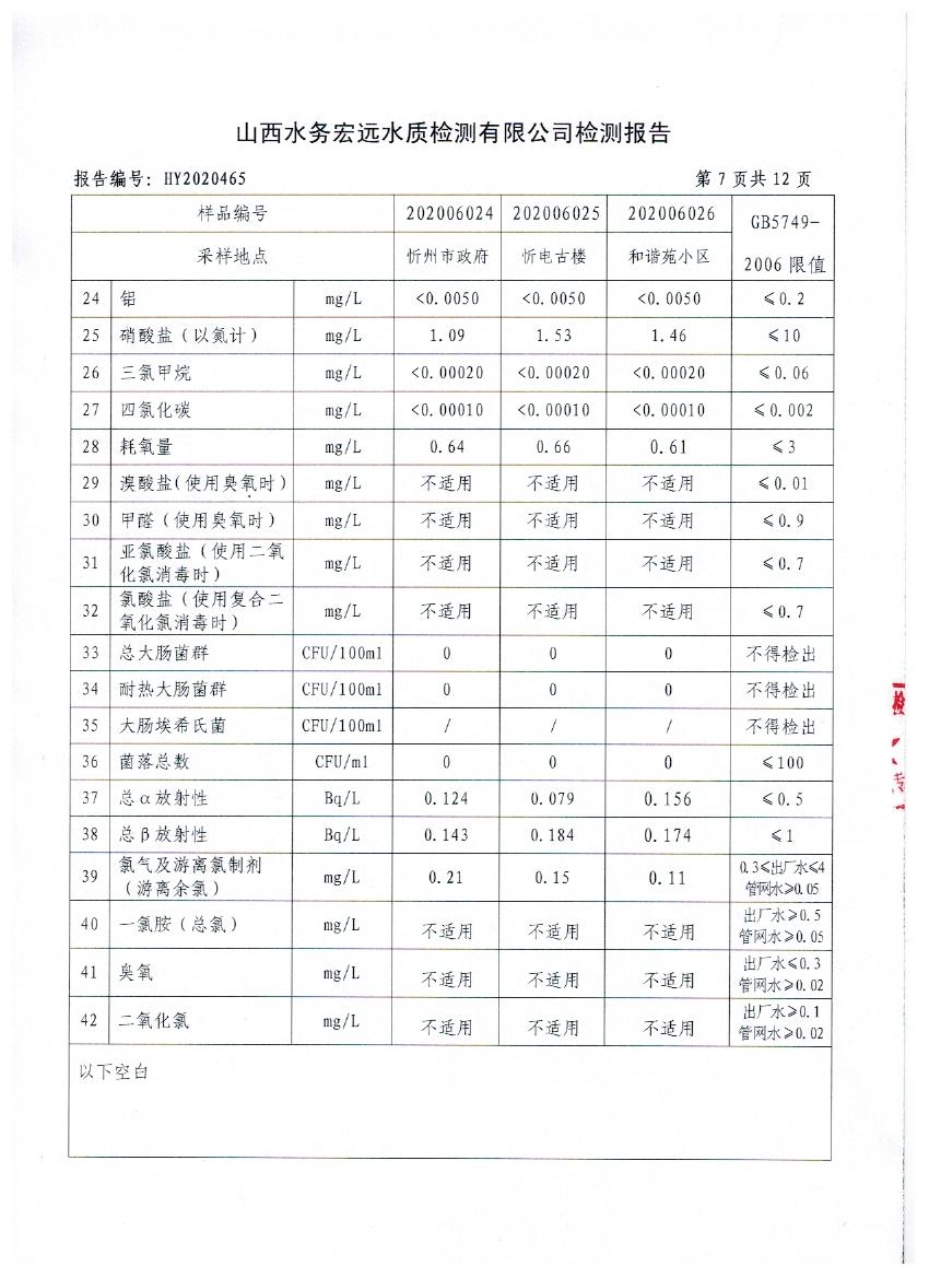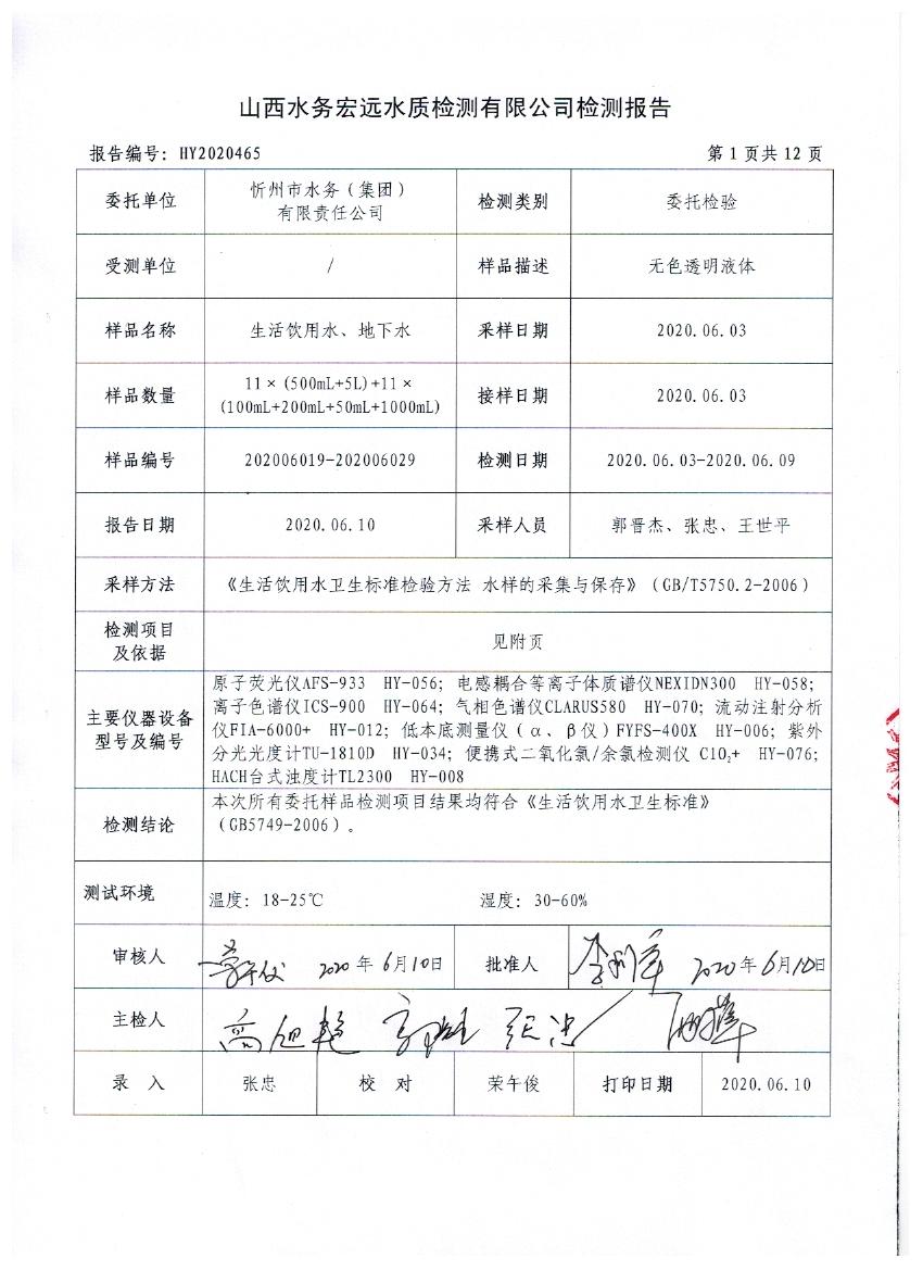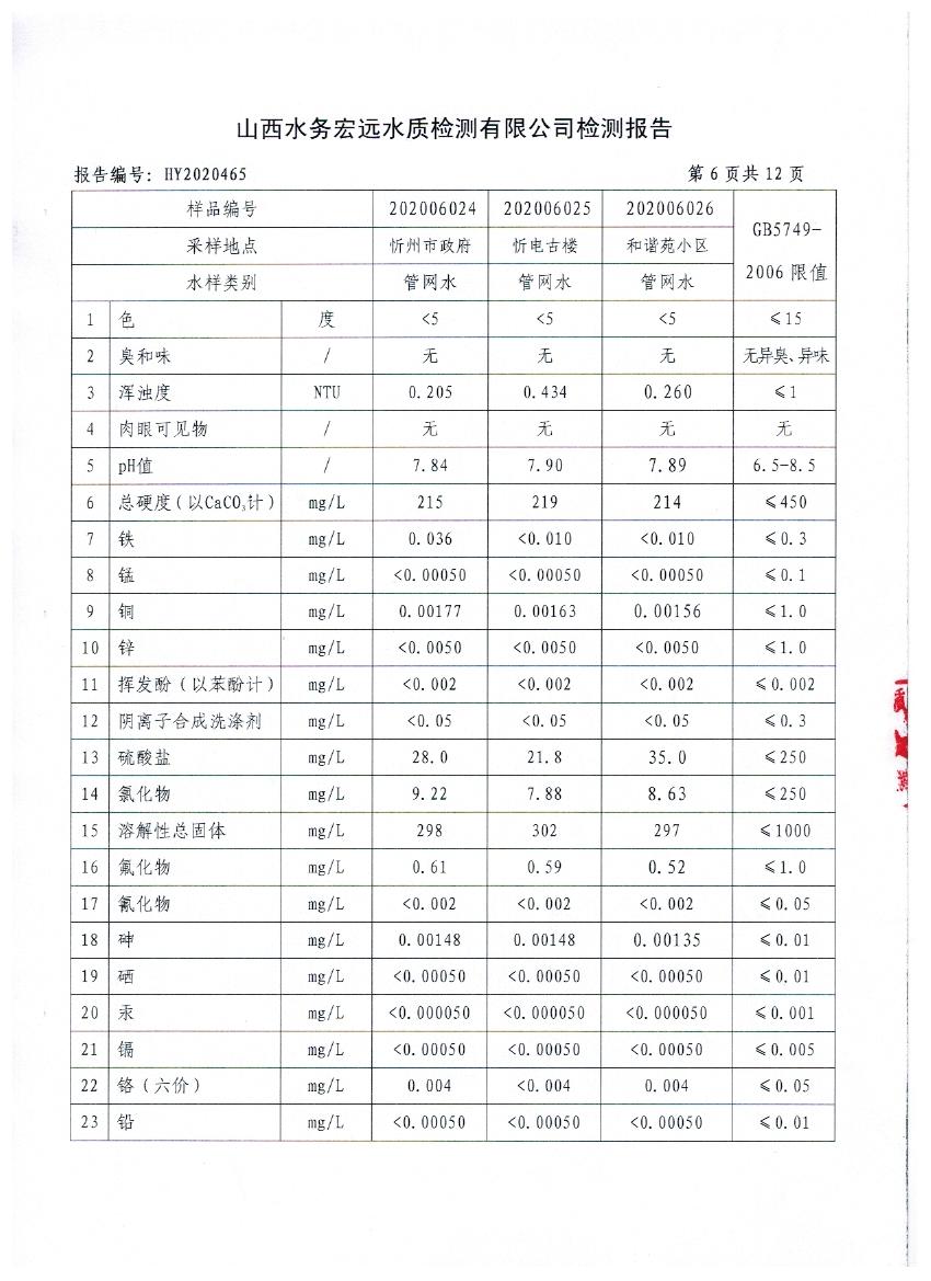 忻州城區(qū)公共供水水源水、出廠水、管網水、管網末梢水2020年6月份水質信息公示
