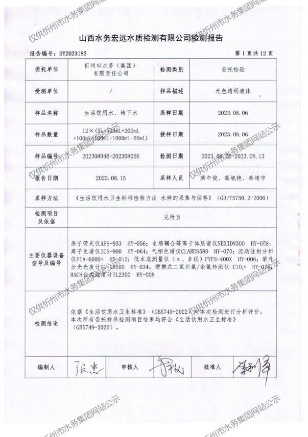 忻州城區(qū)公共供水水源水、出廠水、管網(wǎng)水、管網(wǎng)末梢水2023年8月份水質(zhì)信息公示